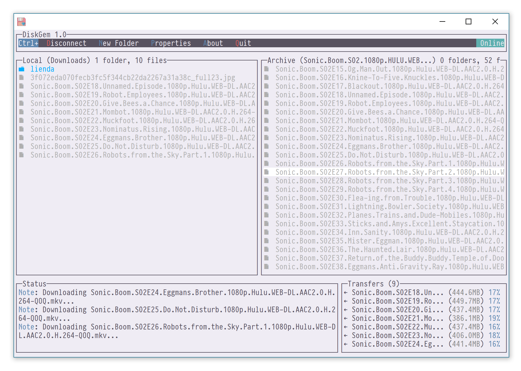 DiskGem currently offers an easy to use, stable command-line user interface that supports parallel file transfers and other useful features. DiskGem will soon also support creating encrypted archives on the server which offer encryption of stored files as well as metadata obfuscation.